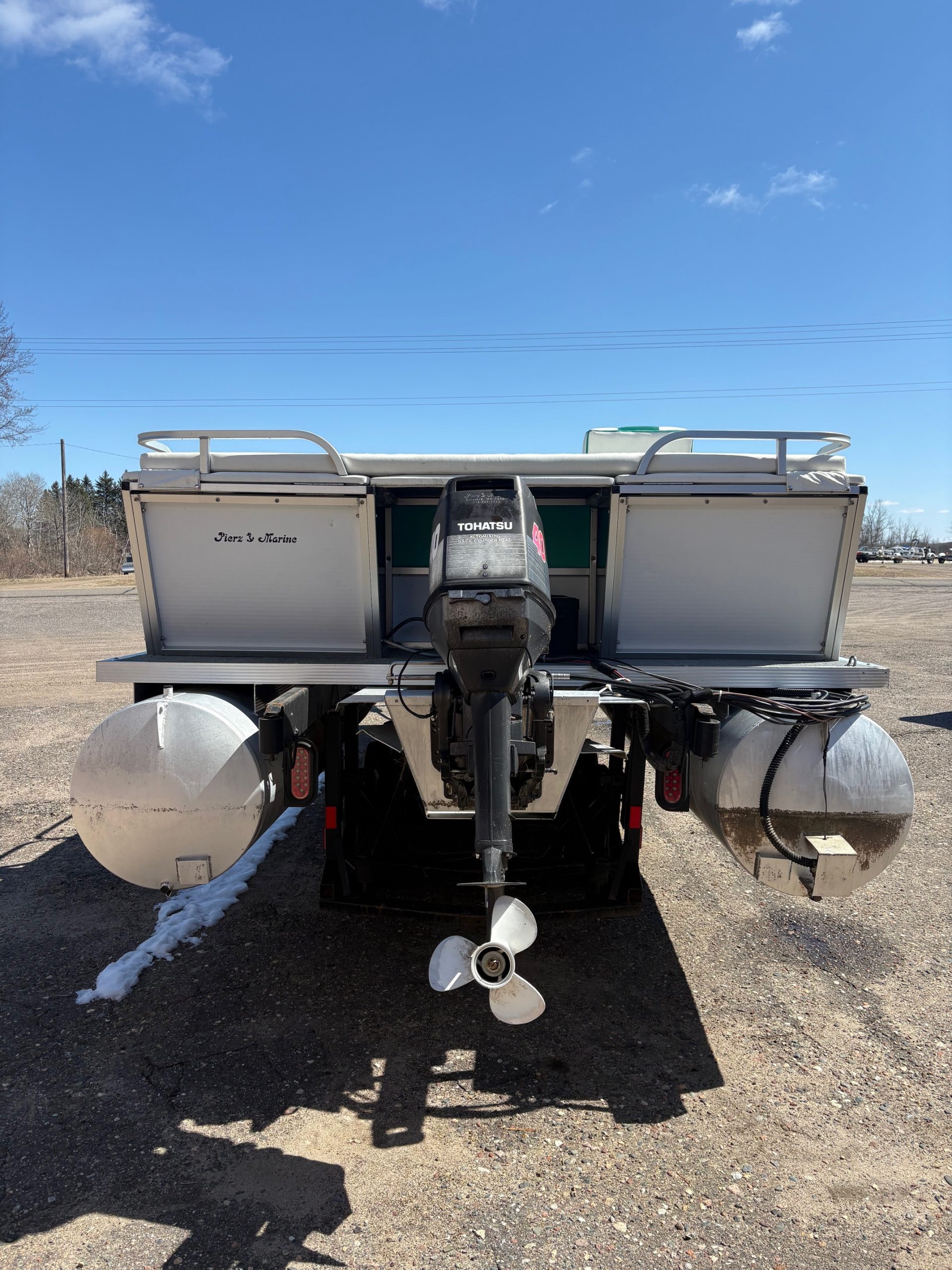 Features: Back bench seat, (2) fish chairs, sundeck, bench seat w/ reversable back rest, table, bimini top, snap on cover, front anchor, Tohatsu 40Hp 2 stroke motor Very clean, well kept pontoon!
