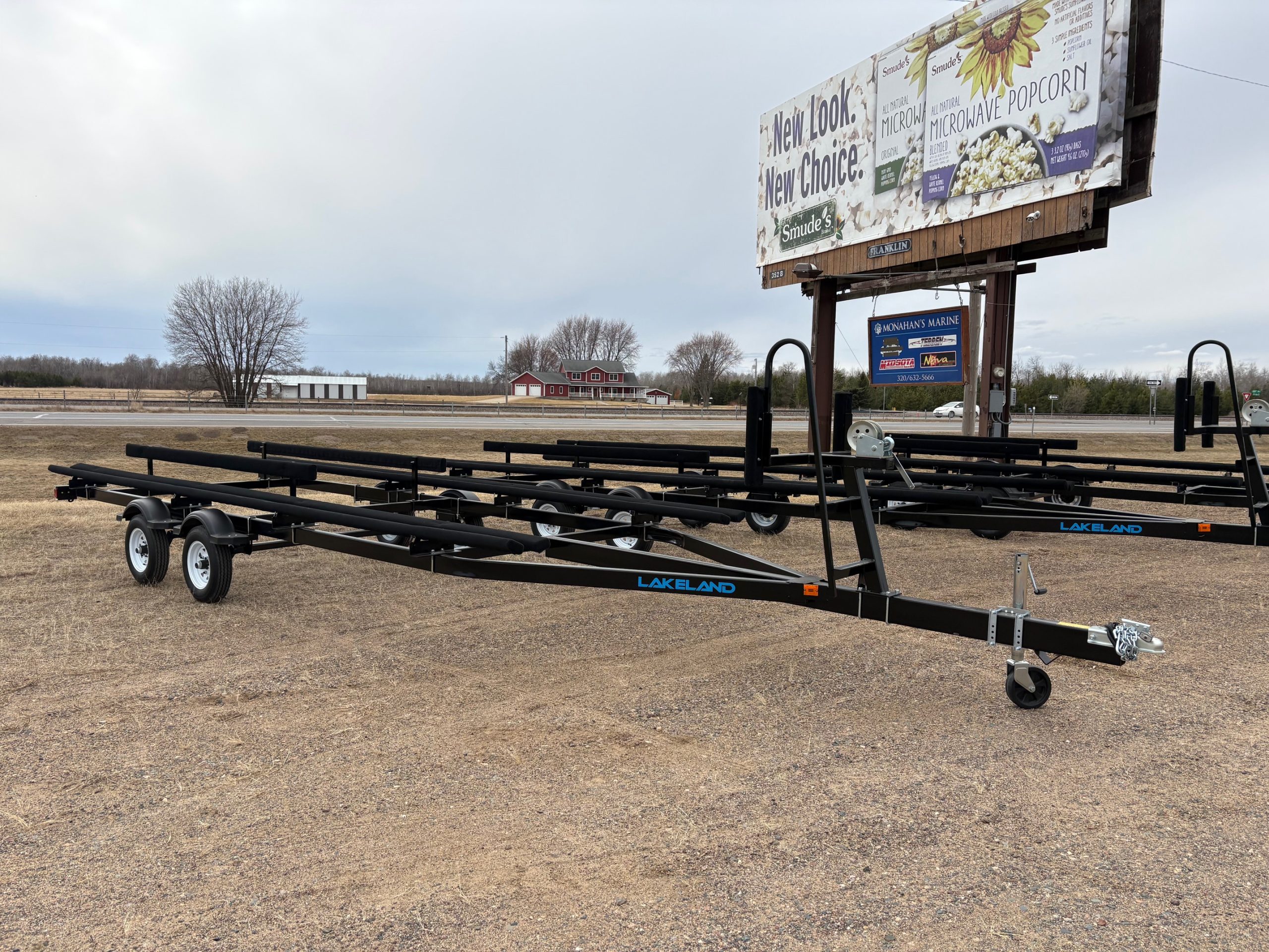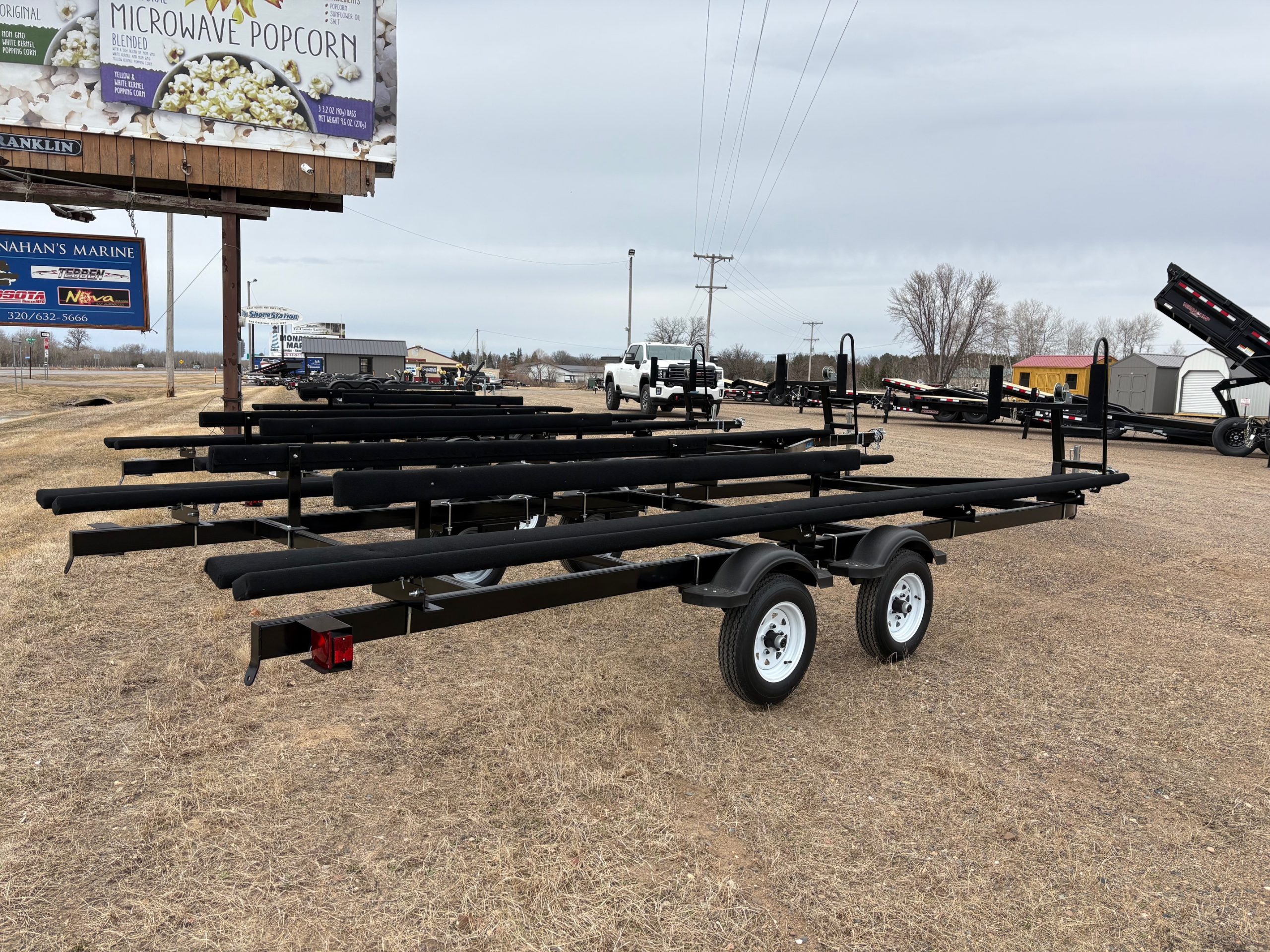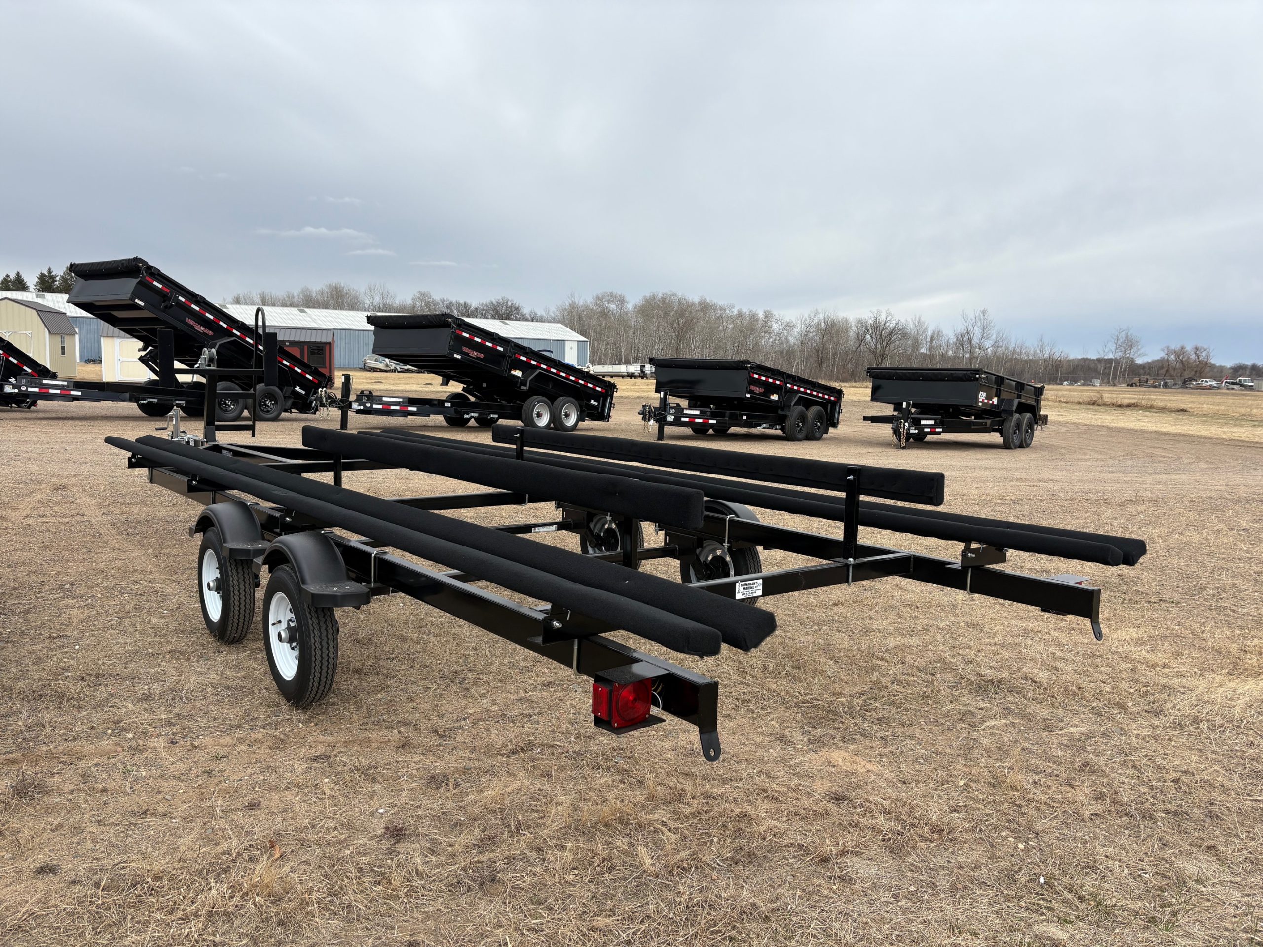 Standard Features: Will fit 22′-24′ pontoons, stair step ladder, load guides, 2″ coupler, torsion axles, LED lights, flat 4 prong plug, 5.30X12 tires, 2X4 frame, lifetime license